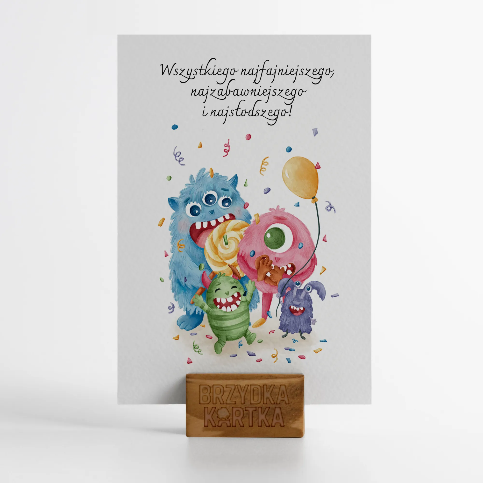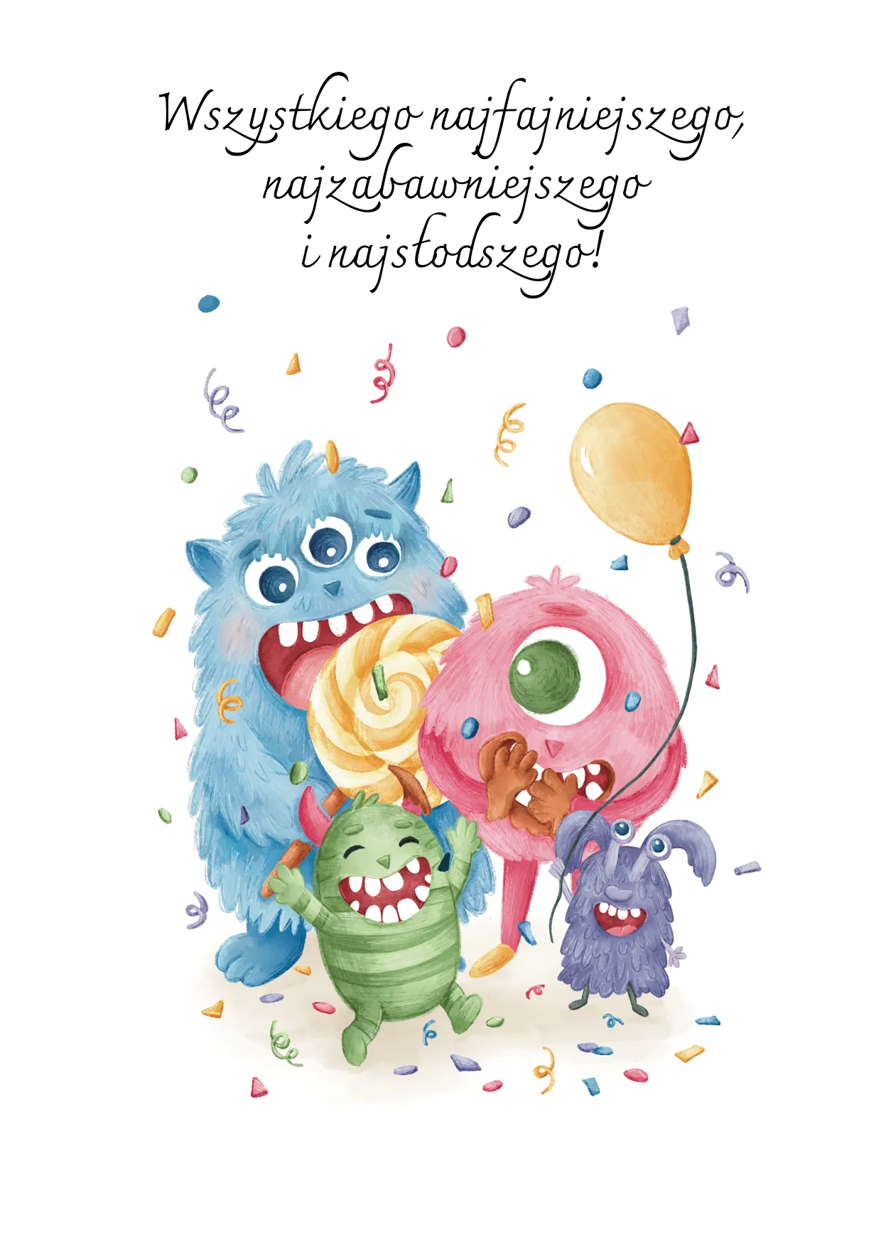 Kartka w rozmiarze A6 (10,5×14,8 cm). Ta ilustracja to eksplozja dziecięcej radości – pełna kolorów, śmiechu i… potworków, które wiedzą, jak robić imprezę!